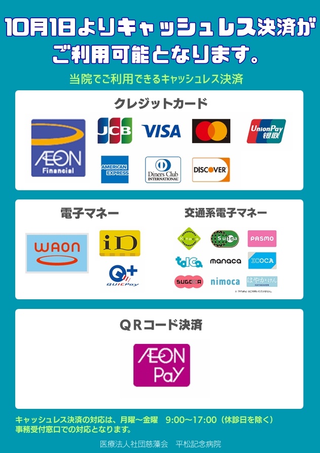 (4) 現金・キャッシュレス決済の会計窓口での支払受付時間は、月曜日~金曜日(祝日を除く) 9時00分~17時00分です。